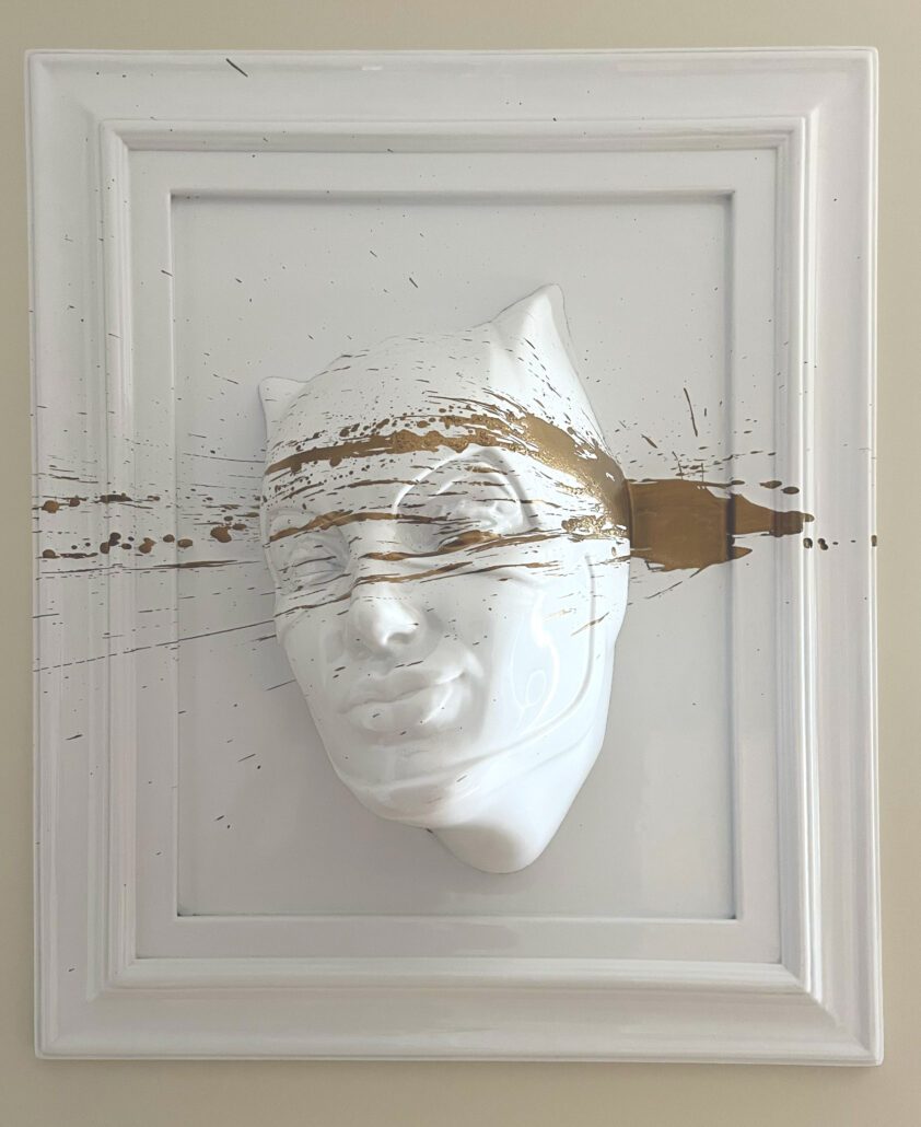 Catwoman Complicità white lucido e splash oro Tecnica: ABS e vernici Dimensioni: 70 x 90 Anno: 2024 Catwoman Complicità white lucido e splash oro Tecnica: ABS e vernici Dimensioni: 70 x 90 Anno: 2024