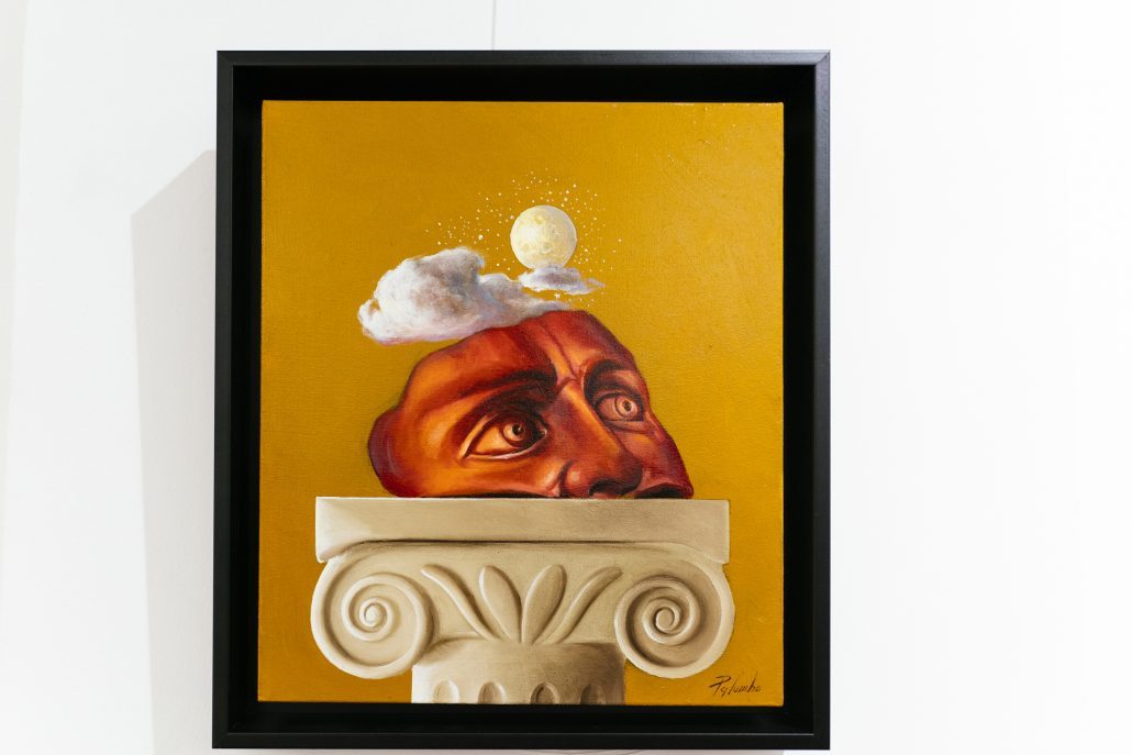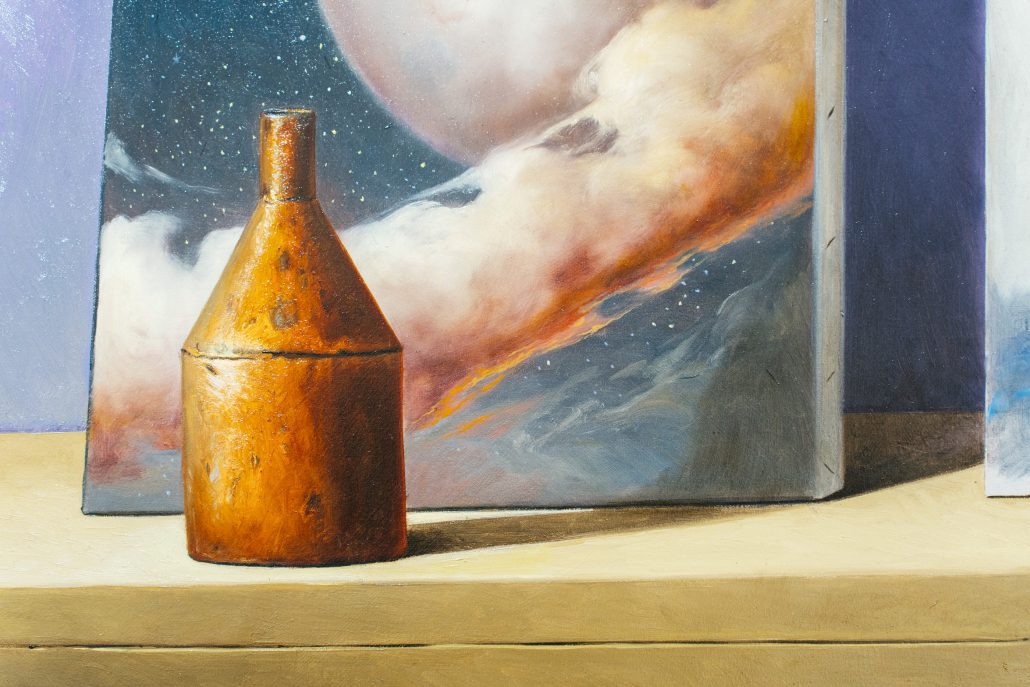 Osservazione e lettura, è così che ha visto la luce “Il Viaggiatore Immobile”, l’ultimo ciclo di Palumbo, nel quale la Metafisica e il Surrealismo si mescolano ancora una volta.In questa serie, ancora più evidente è l’omaggio alla ricerca ideale che Morandi esprimeva attraverso i suoi paesaggi e le sue nature morte.